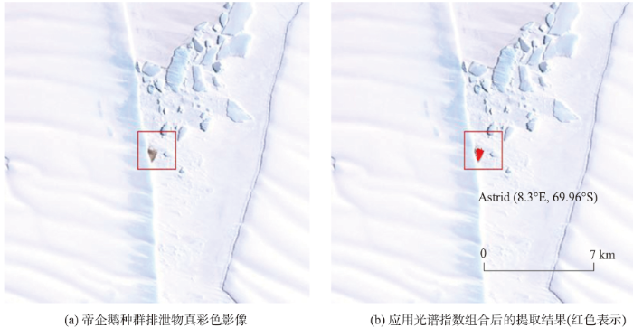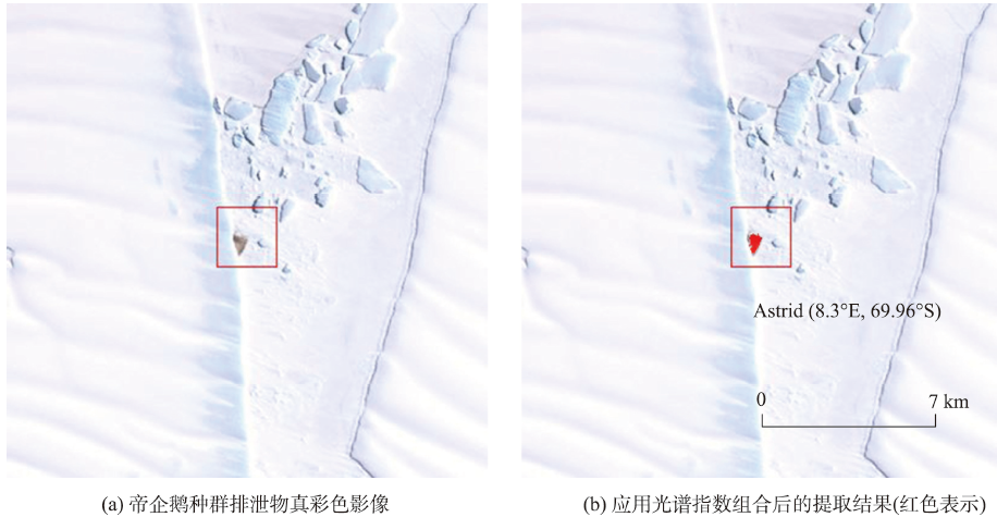 图3给出了该方法应用于Astrid(8.3° E,69.96° S)处的示例,数据信息:LE71691092009320SGS00。图3(a)表示该地区真彩色合成影像,可以发现帝企鹅种群特征比较明显。图3(b)表示应用上述光谱指数组合后的提取结果,结果表明该方法可以有效地识别种群特征。