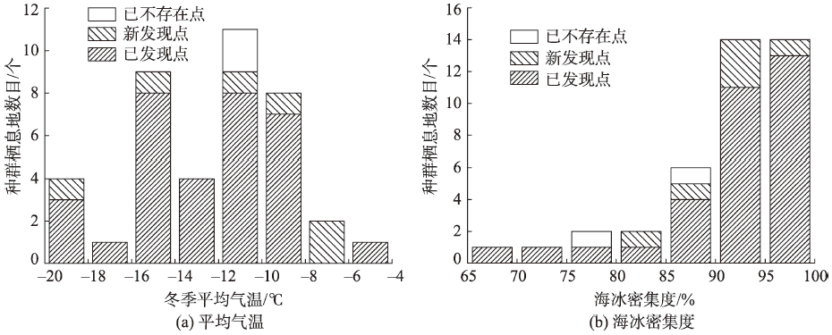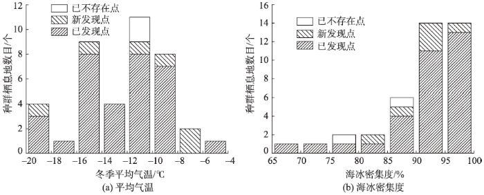 相比于2002年的研究结果,帝企鹅种群的数量有所上升,这可能是因为已往的研究存在未曾发现的种群或是产生了新的帝企鹅种群。考虑到全球变暖和南极气候的复杂性,种群数目的增加有可能是因为一个种群分裂成多个种群,而帝企鹅实际数量并没有增加甚至减少,但这需要更详细的帝企鹅种群数据进行佐证。对比2002年的研究结果,新发现7个种群栖息地,25个种群未发生明显的偏移,6个种群栖息地发生了较大的偏移,未发现的2个种群栖息地已经迁徙或是不存在。帝企鹅种群每年的栖息地位置不会发生较大的变化,发生一定程度上的偏移是合理的。增加和消失的种群栖息地均与当地的气候相关,增加的种群大多出现在气温较低和海冰密集度较高的区域,而消失的种群栖息地情况大致相反。
