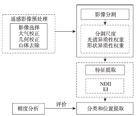Landsat 7 ETM+影像经过预处理后,确定影像的分割尺度,基于分割窗口内像元的光谱特征和几何特征计算对象的光谱异质性和形状异质性,进而生成相应的对象。提取帝企鹅种群排泄物对象与其他地物对象典型的光谱特征差异以实现种群排泄物的识别,从而获取种群栖息地的位置并进行精度评价(图1)。