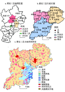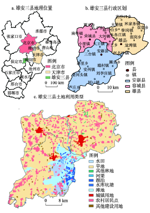 雄安新区地处北京、天津、保定腹地,距离北京、天津市中心各约110 km,规划范围涉及河北省雄县、容城、安新三县及周边部分区域(图1)。本文将雄县、容城、安新三县作为生态安全格局构建的研究区,土地总面积为1557 km2。雄安三县属于暖温带半湿润大陆季风性气候,四季分明,春旱多风、夏热多雨、秋凉气爽、冬寒少雪。全区位于太行山麓平原向冲积平原过渡地带,地形开阔平坦,西北部稍高,南部及东南部地势较低。三县土壤肥沃,土地利用以耕地为主,2015年水田与旱地的面积比例约为2∶5,植被覆盖率相对较低。
