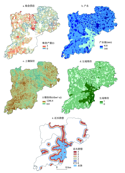 2.3.1 生态源地识别 生态源地是指提供重要生态系统服务的斑块。针对区域典型生态系统,定量评估生态系统服务的供给能力,识别生态系统服务供给的重要区域,可以作为源地识别的有效方法[7]。雄安三县位于华北平原农耕区,土地利用以耕地为主,植被覆盖率相对较低;白洋淀几乎占到安新县土地面积的1/2,旅游资源和生物多样性丰富。针对研究区的自然基底特征和生态环境现状,本文选取了粮食供给、产水、土壤保持、生境维持和近水游憩5种生态系统服务进行定量评价。