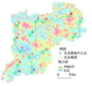 本文采用最小累积阻力(Minimum Cumulative Resistance, MCR)模型提取源地间的生态廊道,该模型考虑到源、距离和景观介面三种因素,计算物种从源地到目的地运动过程中需要耗费的代价,选取其中阻力最低的通道作为源地之间的生态廊道: