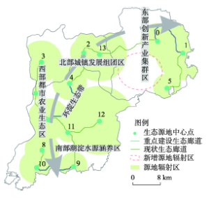 对新增源地辐射区进一步空间分析可以发现,建设面积为16.5 km2的雄县县城位于该区域,面积占比14.5%;而现状土地利用类型则以耕地为主,面积占比69.4%。若要新建辐射面积为227 km2的生态源地,需要预留20~30 km2的绿色基础设施建设用地。但县城作为研究区人口、产业相对较为集聚的地区,相关生产、生活基础设施便利,是区域社会经济发展的重点增长极。因此,雄安新区的生态安全格局优化尤其需要重视对雄县城市空间蔓延的控制,圈定明确的城市增长边界,高效利用城市生产、生活空间,切实保护区域生态空间。