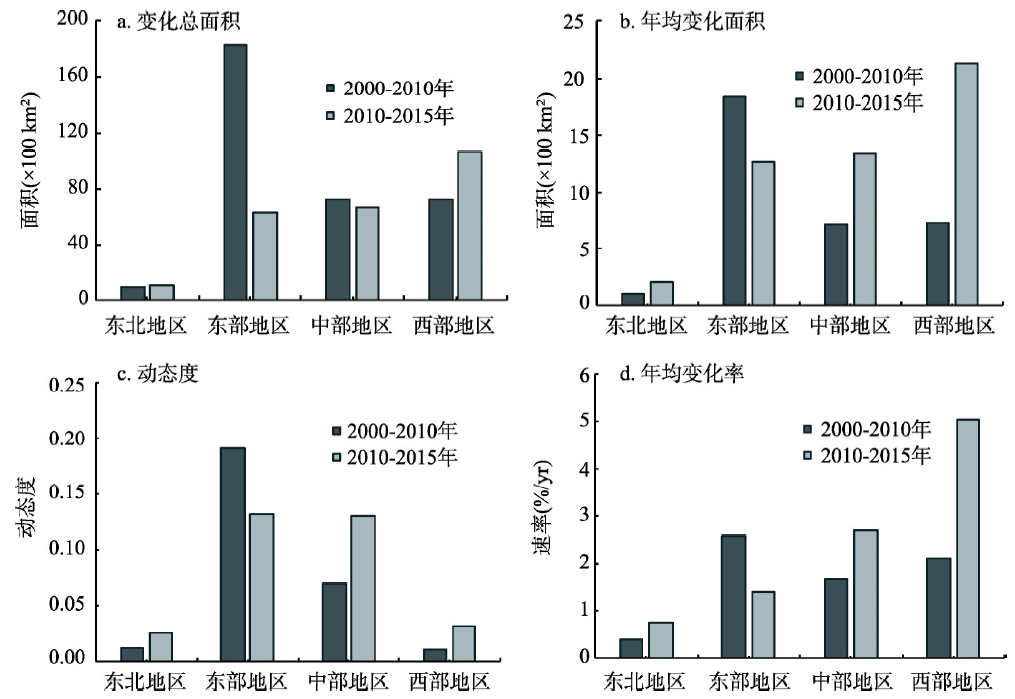 2010-2015年与2000-2010年相比,中国土地利用变化的区域空间格局基本一致,但分区变化出现新的特征。区域土地利用变化的主要特征表现为:东部建设用地持续扩张和耕地面积萎缩,但变化速率有所下降;中部建设用地扩张和耕地面积萎缩加速;西部各类建设用地扩张明显加速,耕地面积增速进一步加快,天然林草面积萎缩进一步加速;东北地区建设用地扩展持续低迷,耕地面积稳中有升,天然林草面积略有下降。