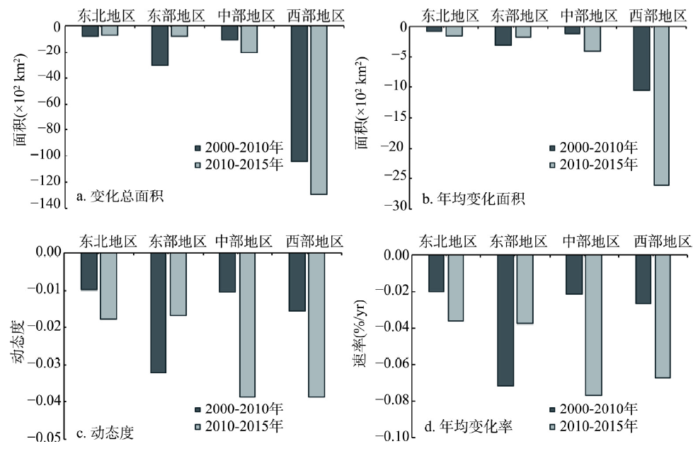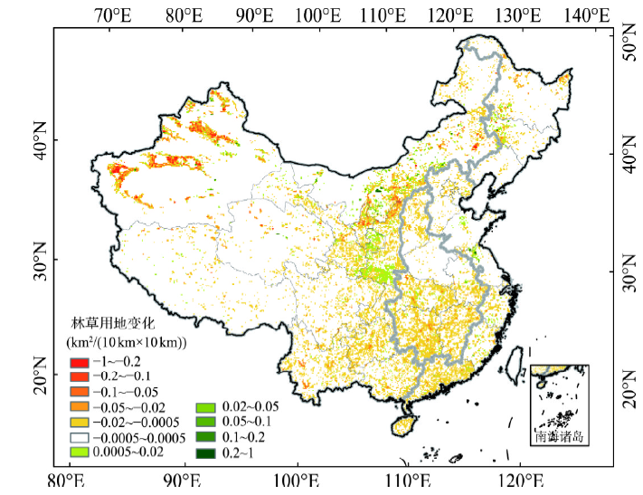 因此,2010-2015年中国林草用地变化特征为:中部增加区域收缩,东西部减少区域扩张;东部林草用地减少放缓,而东北、中部和西部地区林草用地减少加速;西部和中部林草地减少基本持平,大于东部和东北;中部林草用地减少速率高于西部、东部和东北。