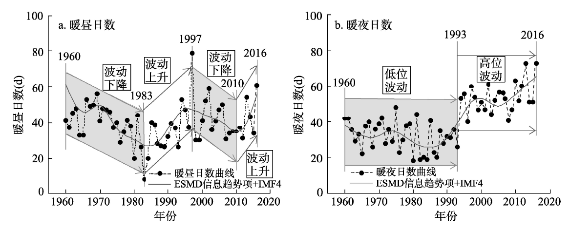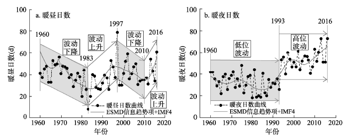 图3 1960-2016年西安暖昼日数和暖夜日数变化特征