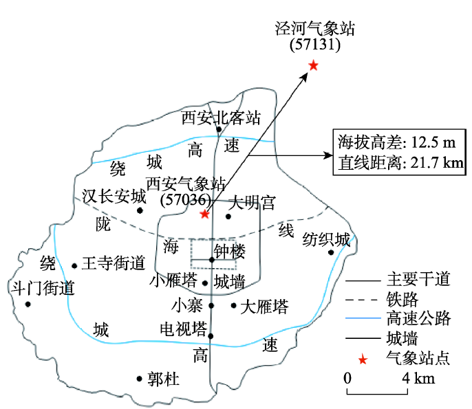 本文逐日平均温、最高温和相对湿度数据来源于中国气候数据网。西安气象站时间序列为1960-2005年,泾河气象站时间序列为2006-2016年。西安气象站(57036)观测数据中断的原因是:城市化进程加快,原设立在城市北郊的气象站点观测环境发生变化,对客观记录气候资料产生影响[11]。2006年西安气象观测站迁至泾河工业园区,承担国家基准气候站的任务(图1)。为了验证迁站后资料一致性,西安气象站点延后观测两年,2009年之后不再更新气象数据。