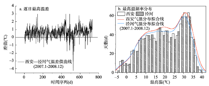 图2 2007-2008年西安和泾河逐日最高温差值曲线和频率分布图