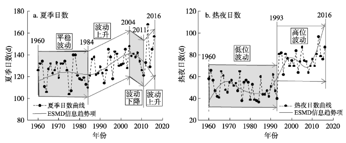 图4 1960-2016年西安夏季日数和热夜日数变化特征