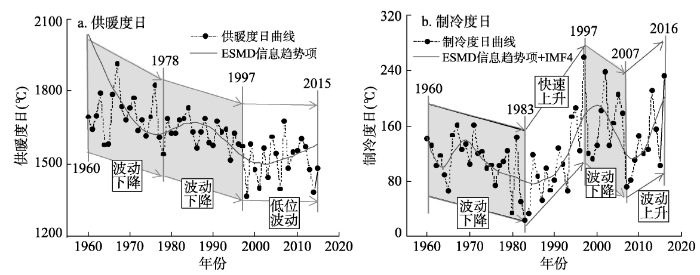 图6 1960-2016年西安供暖度日和制冷度日变化特征