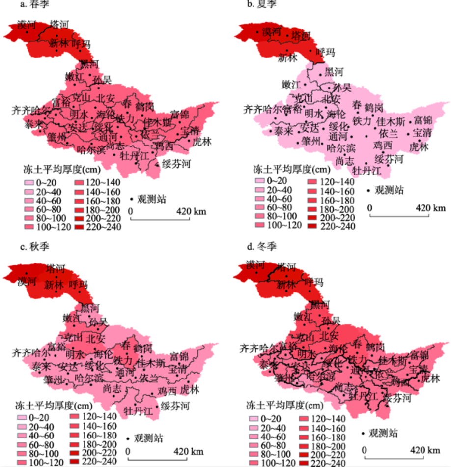黑龙江省冻土冻结一般从秋季开始,82%的冻土厚度在40~50 cm之间(图10c);冬季冻土冻结范围逐渐扩大,51%的冻土厚度在120~140 cm之间,11%的冻土厚度在140~160 cm之间,4.5%的冻土厚度达到200~220 cm之间,冻结厚度普遍达到100 cm以上,在大兴安岭地区冻结厚度达到200 cm以上(图10d);春季,随着温度的升高,冻土厚度在全省范围内开始减小,除大兴安岭观测点外,72%的冻土厚度下降到100~120 cm之间,其中伊春、泰来观测站点冻土厚度减少较慢,呈现出空间差异性(图10a);夏季后,冻土冻结厚度进一步减小,除大兴安岭观测点外,黑龙江省冻土基本完全融化(图10b)。