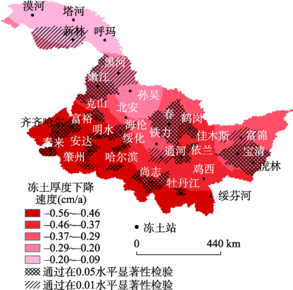 本文分别将32个观测点的冻土厚度以线性函数来拟合原序列,,其中a值的正负表示各站冻土厚度随时间变化的方向,绝对值大小表示变化速率,作为判定冻土厚度的变化速率。发现黑龙江省全区域冻土厚度为不同程度的递减趋势,递减速率绝对值大小由北到南逐渐升高。南部冻土厚度降低的快,而北部降低的慢。全省区域内71%的冻土站冻土厚度呈现显著递减趋势。其中新林、通河、肇州、富锦、黑河观测站的冻土厚度呈现为显著减少趋势(通过0.05概率水平检验),占所有站点的15%,平均减少速率为-0.26 cm/a;嫩江、伊春、佳木斯、依兰、哈尔滨、尚志、齐齐哈尔、安达、克山、富裕、泰来、宝清、虎林、明水、海伦、鹤岗、绥化观测站的冻土厚度呈现极显著减少趋势(0.01概率水平检验),占所有站点的56%,平均减少速率为-0.49 cm/a(图11)。