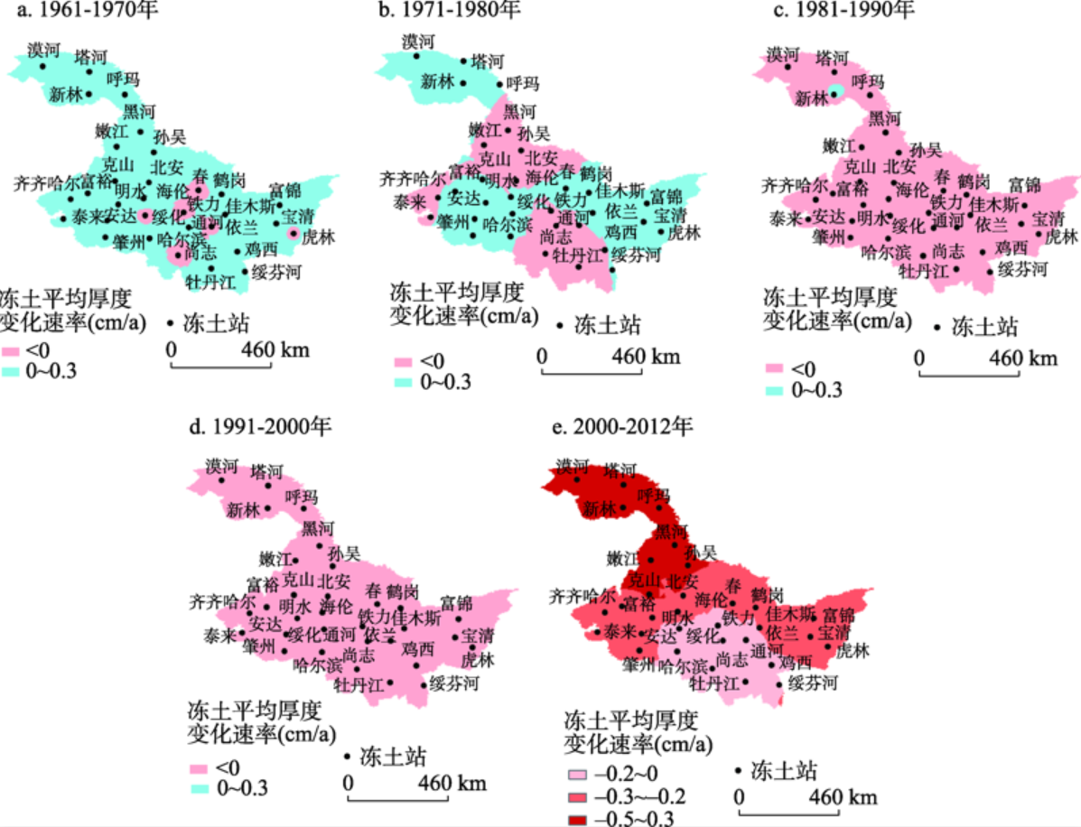 黑龙江省冻土厚度按年代划分在空间上表现出明显的变化特征。20世纪60年代(1961-1970年)全省冻土基本表现为增厚趋势,只有10.4%的面积冻土厚度减少(图12a);20世纪70年代(1971-1980年),冻土厚度减少区的面积越来越大,增厚区的面积越来越少,冻土厚度减少的面积已经达到39.8%(图12b);20世纪80年代(1981-1990年),冻土厚度减少面积已经占了99.4%(图12c);20世纪90年代(1991-2000年),冻土厚度减少面积占了100%(图12d);21世纪最初的10年(2001-2012年),黑龙江省全省区域冻土厚度下降速度明显增快,全省范围内冻土厚度下降速率均表现出大于20世纪80年代,北部大兴安岭冻土厚度下降速率最快(图12e)。