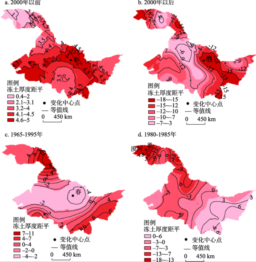 为了验证EOF分析结果的准确性,本文按照不同年代的冻土厚度距平值进行空间插值,可以看出,在2000年以前,冻土厚度距平值为正(图15a),2000年以后,冻土厚度距平值为负,冻土厚度距平高值区主要位于伊春观测站附近(图15b)。在20世纪60年代中期到20世纪90年代中期冻土厚度距平值负值区主要集中在黑龙江省中部地区,正值区主要集中在东南部和西北部(图15c),在20世纪80年代初期至中期,冻土厚度距平值负值区主要集中在黑龙江省西部地区(图15d)。说明了黑龙江省冻土厚度在呈现出整体下降变化特征的前提下,中部冻土厚度与西部和东南部呈相反变化的特征,其中伊春、铁力以及漠河观测站为变化中心区域可以称为冻土变化敏感区或脆弱区,也进一步说明EOF所分析的冻土厚度空间异常特征的准确性。