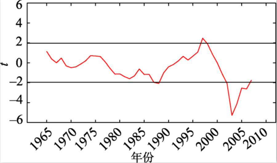 黑龙江省近50年冻土平均厚度时间序列Mann-Kendall突变检验分析表明,如图5所示,在1997年和2001年有两个交点,两个交点均位于置信区间外,不能确定是否为突变点。本文又对近50年冻土平均厚度时间序列进行了滑动t检验,在滑动t检验中,有3个时间点前后出现了突变,分别是1988年前后,1997年前后和2001年前后(图6)。综合两种检验方法的结果,可以确定在1997年和2001年有突变的可能性,也就是说,在20世纪90年代末期,黑龙江省冻土厚度发生了突变,在2001年以后的冻土厚度明显小于2001年以前,2001年有可能为冻土厚度突变时间。