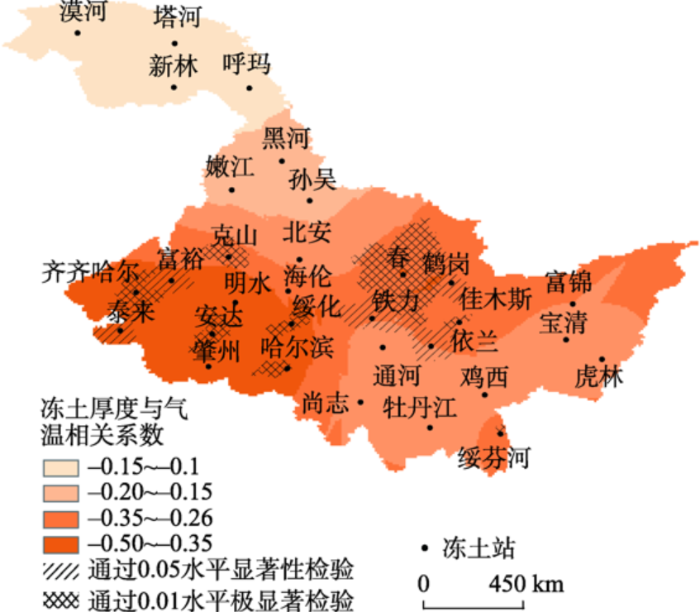 从空间分布看,年平均气温与冻土厚度的相关系数具有空间差异性。可以说气温是影响黑龙江省中西部冻土厚度变化的主要因素之一,在黑龙江省东南部和西北部冻土厚度与气温呈不显著相关关系,而且冻土厚度也为不显著下降趋势,这些冻土观测点主要分布在森林地区,研究表明植物的蒸腾作用会吸收土壤中的水分,从而带走部分热量,植物的根系有良好的隔热作用,从而影响冻土的厚度与分布[28]。可以说对于不同区域影响冻土厚度的主要因素各有不同,需进一步讨论(图13)。