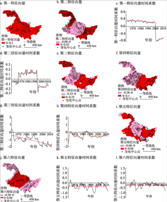 第四特征向量(图14f)显示,黑龙江省西部和东部显现出相反的变化趋势,时间系数显示(14h)西部地区在80年代初期至80年代中期冻土厚度表现为下降趋势,下降中心在漠河观测站附近。
