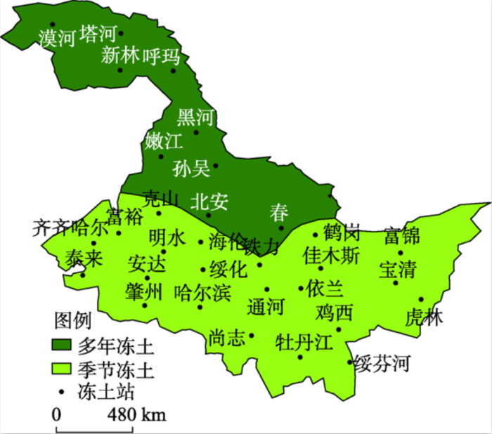 黑龙江省位于中国东北部,气候为温带大陆性季风气候,地势大体为北部、西北部、东南部高,东北部、西南部低。根据寒区旱区科学数据中心发布的基于《中国冰雪冻土图》的中国冻土分布图[25],本文选取以黑龙江省为界限的冻土区,研究区内包含多年冻土区和季节冻土区(图2)。