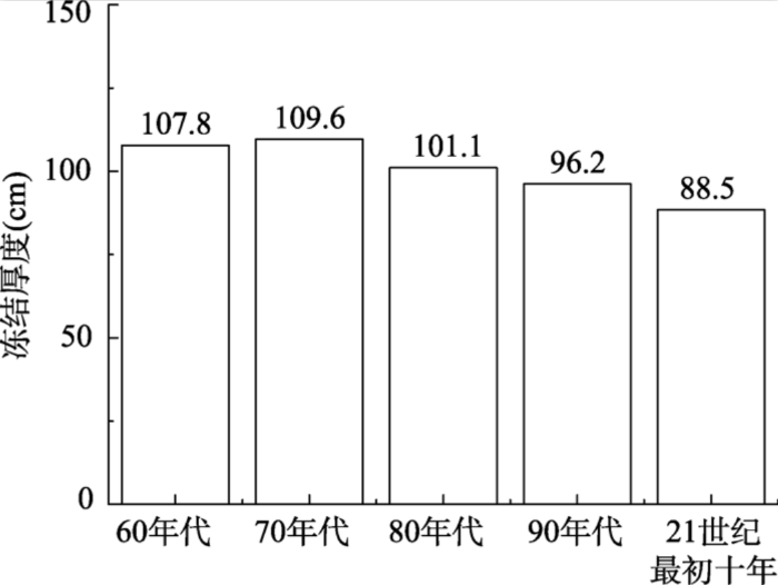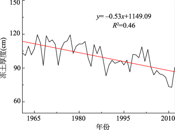 冻土是一种对温度敏感和易变的地质体,与气候之间相互作用,一方面气候变化会影响冻土厚度和冻土分布范围[1,2];另一方面冻土的消融也可能引起水文、工程基础等变化[3]。在全球气候变暖备受关注的大背景下,分析冻土厚度时空变化特征,对掌握冻土退化的影响以应对气候变化显得尤为重要。研究表明,近60年来黑龙江省升温速率远高于东北及全国的升温速率,是升温幅度最高的省份[4],也是冻土退化的区域之一[5,6]。