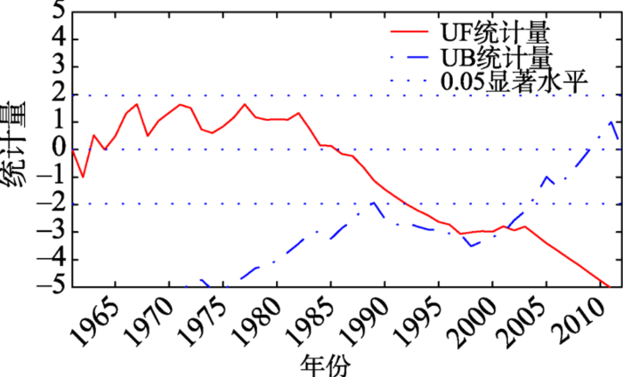 可见,秩序列是第时刻数值大于第时刻数值的累计数。在时间序列随机独立的假定下,定义统计量[20]: