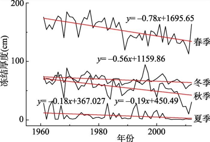 将黑龙江省冻土厚度数据按照气象部门的季节划分标准,分别划分为春季(3-5月)、夏季(6-8月)、秋季(9-11月)、冬季(12月-翌年2月)4个季节时间段[27]。近50年来黑龙江省春季、夏季、秋季、冬季平均冻土厚度分别为113.9 cm、17.3 cm、37.7 cm、135 cm 。各个季节的冻土厚度均呈下降趋势,春季、夏季、秋季、冬季冻土厚度的下降速率分别为-0.78 cm/a、-0.18 cm/a、 -0.19 cm/a、-0.56 cm/a,其中春季呈极显著下降趋势(通过0.01概率水平检验),其他三个季节均为不显著下降趋势。也就是说,黑龙江省春季冻土厚度减少最为显著(图7)。相比1961年,至2012年时,黑龙江省春季、夏季、秋季、冬季的平均冻土厚度分别减少了40 cm、12 cm、10 cm、27 cm,变异系数分别为11.6%、7.8%、10.9%、8.9 %,春季冻土厚度变化相对来说最不稳定。