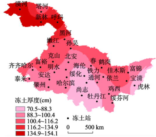 (2)黑龙江省冻土厚度总体分布呈现由北向南逐渐变薄趋势,但空间分布并不与纬线平行,中部地区冻土厚度较同纬度其他地区偏低。