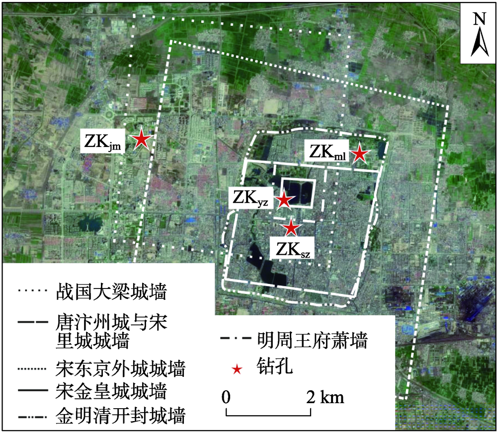 本研究钻孔布设依据有以下两个方面:第一,在城墙的阻挡作用下,入城洪水相对较少,导致城墙内外沉积地层存在差异,故而在开封城墙内外沿洪水流路(自西北向东南)布设钻孔。第二,不同区域人类活动种类和强度的差异对OC和BC密度与储量影响不同,根据各个朝代开封城的具体位置和范围,在受人类活动影响程度不同的区域布设钻孔。鉴于此,在开封市布设4个钻孔(图1),分别位于河南大学师专校区(ZKsz)、医专校区(ZKyz)、明伦校区(ZKml)和金明校区(ZKjm)。ZKsz和ZKyz均位于开封市老城区,岩芯自下而上囊括战国以来各朝代的文化层,人类活动强烈。ZKml在唐代之前一直位于人类活动扰动较小的城外,宋代时被圈进外城之内,到了金代才被圈进内城,人类活动逐渐增强。ZKjm西距战国大梁城西城墙约0.5 km,东侧紧邻北宋东京外城西墙,自公元前225年鸿沟水患淹没大梁城后直到2002年,长期位于历朝城市的郊区,人类活动影响轻微。