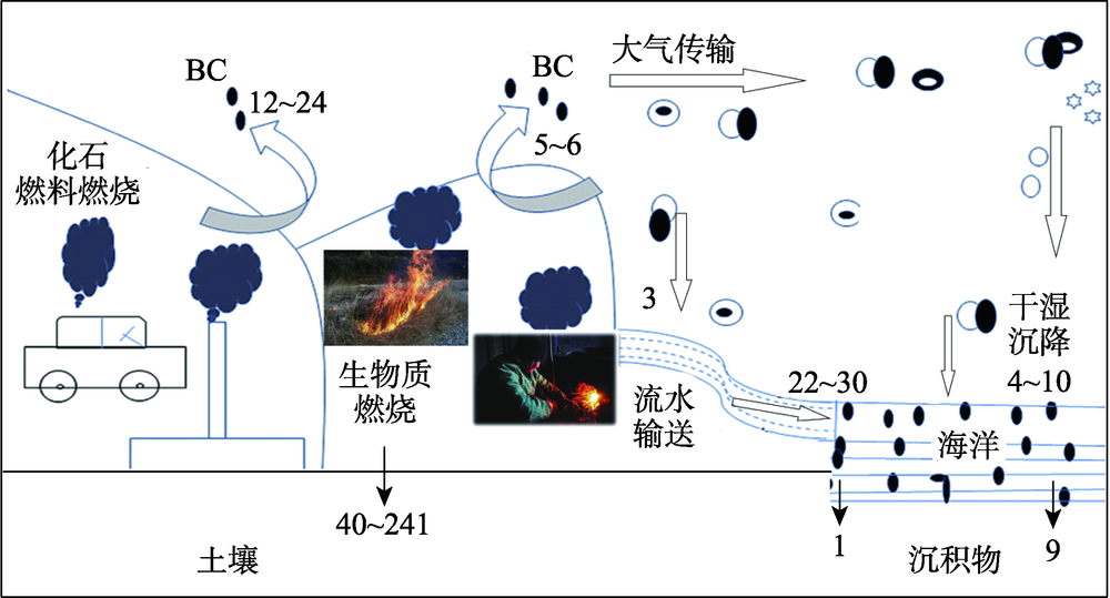 据估计,全球每年产生50~270 Tg BC[12],其在土壤和沉积物与其他环境介质之间的循环通量见图3。从图3可以看出,BC在大气、海洋、土壤及沉积物中的储量还存在不确定性。尽管土壤是BC最重要的“归宿”,但目前还远不清楚BC在各种类型及不同区域土壤中的含量。但可以肯定的是,BC碳库在土壤碳库中占有较大比例,且BC在土壤稳定碳库中占有非常重要的地位。研究表明[31,32,33],土壤表层的BC在生物扰动或水分淋滤作用下发生垂直迁移,这部分BC由于埋藏较深,可以成为更稳定的碳库。这些深层地层中被忽略的BC很难再释放温室气体进入全球碳循环中,在一定程度上对抑制全球变暖具有重要意义。黑碳的形成使大气中CO2的净含量减少约2%~18%[12],土壤或沉积物中的BC能从地—气碳氮循环中捕获并固定碳氮,减少大气温室气体(CO2、CH4、N2O等)的含量[41,42]。据此,有人提出在无氧或缺氧条件下将木本或草本植物进行低温热解处理,通过人为制造BC的途径来实现碳捕获与储存,炭化后得到的BC又重新回到土壤中,达到固定碳氮的目的,进而解决因温室气体排放所引起的全球气候变暖问题[43,44]。