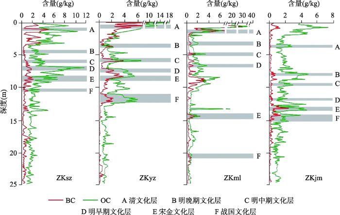 (1)开封地层OC和BC含量随深度变化波动明显,垂直分布特征较为一致,高值主要集中在岩芯0~1 m,其次是各朝代的文化层附近。城区钻孔(ZKsz、ZKyz和ZKml)OC和BC含量显著高于郊区钻孔(ZKjm),而城区钻孔之间的差异并不显著。