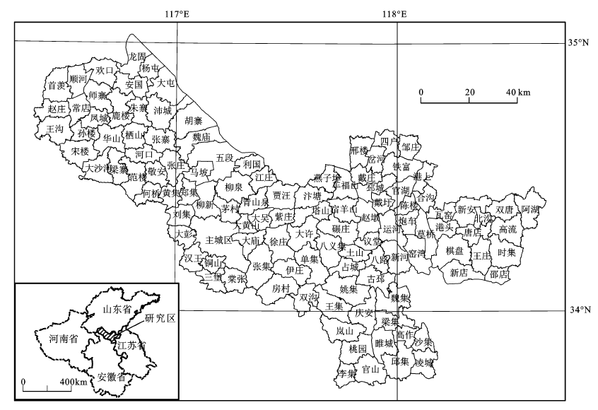 徐州市地处江苏省西北部,属于该省“1+3”功能区之一,是苏、鲁、豫、皖四省接壤区域的省际边界型城市,也是中国重要的老工业城市和再生性资源型城市(图1)。2015年,该市面积11 764.89 km2,人口866.90万人,GDP为5 319.88亿元,2003~2015年工业GDP占比由40.49%演变为37.15%,人口城镇化率由40.4%提高到61.05%,建成区面积由89 km2增加到255 km2,表明徐州市工业化和人口城镇化演进引起城镇空间的扩张。随着淮海经济区中心城市建设战略的实施,作为“一带一路”倡议的空间战略支点以及《全国国土规划》的重点开发区域,协调好工业化和城镇空间的关系,成为推进徐州高质量发展面临的战略课题。针对徐州基本摆脱资源依赖和向工业化后期阶段转换的具体市情,从综合视角开展工业化与城镇空间的相互作用关系及其影响因素研究,不仅有利于推进再生性资源型城市工业化与城镇空间协同发展,也有利于资源型城市可持续发展,故本研究具有较强的典型性。