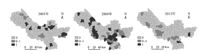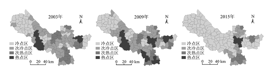 Fig.6 Evolution of hotspot areas of coefficients of urban space response to industrialization in Xuzhou city from 2003 to 2015