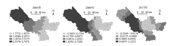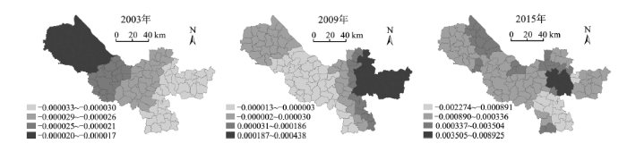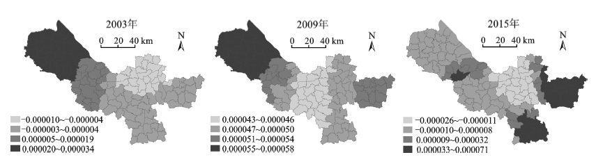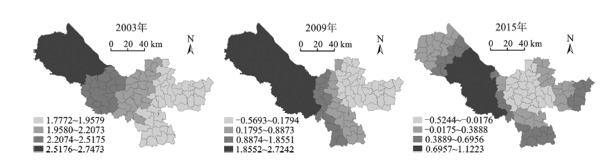 从发展阶段看(图9),2003年发展阶段回归系数高值区集中分布在丰、沛两县所辖镇域,具有显著的空间集聚性特征。回归系数低值区主要为邳州所辖镇域。2009年发展阶段回归系数低值镇域转移至徐州市区周围;2015年,发展阶段回归系数的高值区在新沂东部、睢宁东南部的部分镇域,呈现由东南高西北低的分布格局。主要是由于十五、十一五期间徐州西北部经济阶段低,经济特别是工业发展对城镇空间扩张的影响作用最为显著,而十二五末徐州东南部更注重小城镇建设,邳州的大部分镇域发展阶段的影响较弱,今后应加强重视工业发展,推进工业发展与城镇建设协同发展。