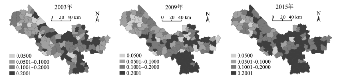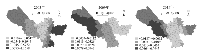 从投资因素看(图8),2003年投资因素回归系数呈现中间低而东西两侧高的“凹”字型格局,特别是新沂和睢宁东南部(包括沙集、邱集、凌城3镇)形成2个高影响区域。东陇海产业带建设带来投资大增,由此推动城镇空间扩张。2009年和2015年投资因素影响程度较高的镇域集中分布在徐州市及周围镇域。以上表明,徐州市及周围镇域作为徐州市经济发展水平较高的区域,固定资产投资一直保持较高水平,吸引外来资金的能力较强,表明投资因素对工业化城镇空间响应的促进作用保持在较高的水平,也进一步表明外资投入对工业化和城镇空间扩展的影响作用在增强。