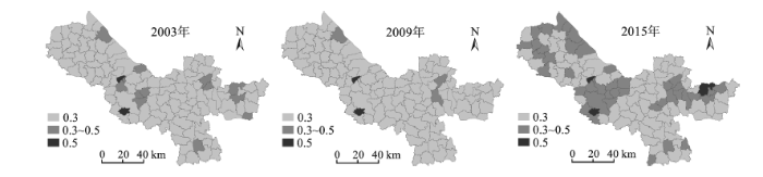 Fig.3 Spatial pattern of coupling and coordination value of industrialization and urban space in Xuzhou city from 2003 to 2015