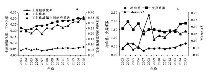 由公式(3)计算出2003~2015年徐州市工业化城镇空间响应指数,绘制成图4。图4a表明研究期内徐州市工业化城镇空间响应强度呈波动性上升趋势,年平均增长率为26.38%,其中镇域工业化发展一直呈上升趋势,城镇化率一直是平缓增长的速度;2003~2006年为工业化城镇空间响应系数呈波动性上升趋势,2006年提高到0.251;2007~2015年为持续增大阶段,工业化城镇空间响应系数由0.229提高到0.360,增加幅度为13.1%。同期,徐州市各个镇域的空间差异总体呈增大趋势。2003~2015年以标准差测量的徐州市工业化城镇空间响应强度的绝对差异呈波动性扩大趋势,以变差系数测度的相对差异呈波动性上升趋势。从空间角度看,2003~2015年徐州市工业化的城镇空间响应程度总体上呈集聚的趋势,由负相关向正向集聚演变趋势,Moran’s I值负值转为正值,由异化到集聚,集聚水平很低但存在集聚的趋势,但近年来集聚趋势有进一步增强趋势(图4b)。
