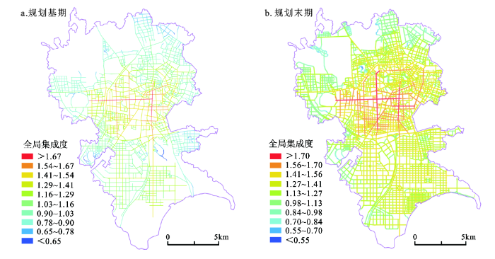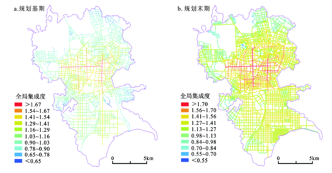 集成度体现了空间单元所具有的可达性、便捷性以及集聚吸引人口的能力,进而体现出一个单元空间相对其余单元空间的中心性。通常,集成度大于1且值越大时,空间的集聚性就越强,反之则越弱。关于空间句法模型更为详细的原理详见相关文献[17],此处不再赘述。