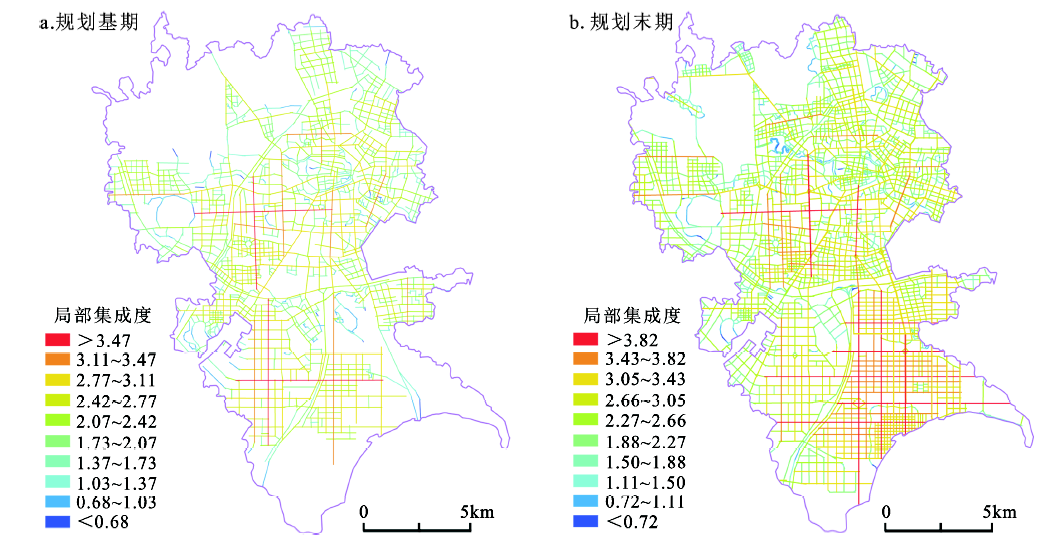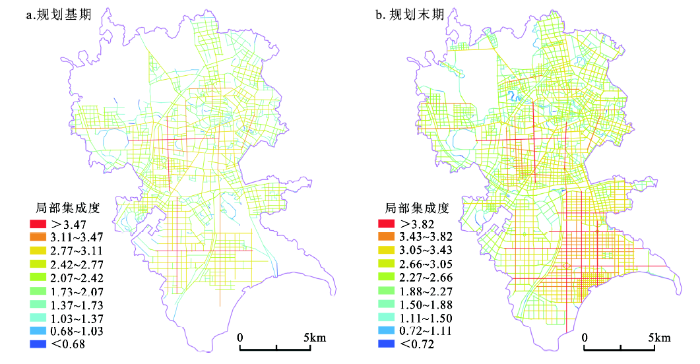 根据图2,2011年全局集成度最高的第10级单元空间有2个,即东西向黄山路和南北向徽州大道所代表的区域(图2红色线条);2020年全局集成度最高的第10级单元空间有4个,即除了黄山路和徽州大道以外,增加了南北向的合作化路和东西向太湖路所代表的区域(图2红色线条),由此形成了以两纵两横为骨架的城市集成度集中区,这意味着规划后城市空间中集聚能力大的区域有所增加,未来人口分布的集聚区域也将随之增加。