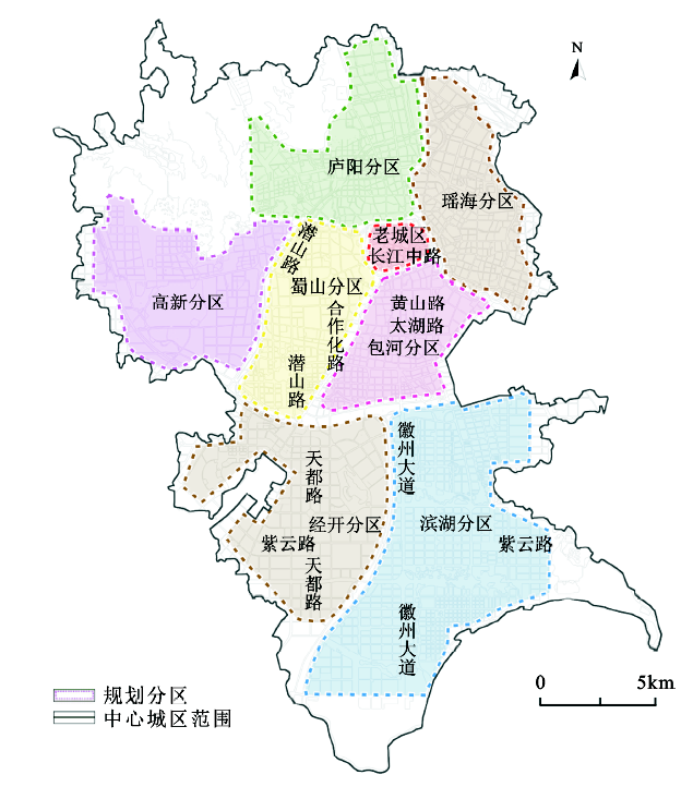 本文以合肥市中心城区为案例研究区。作为安徽省省会,合肥是长三角世界级城市群的副中心城市,是“一带一路”和长江经济带两大国家战略的双节点城市,同时合肥与北京、上海一起构成了三大综合性国家科学中心。根据2016年5月国务院批复的《合肥市城市总体规划(2011~2020年)》,中心城区包括老城区、蜀山分区、包河分区、庐阳分区、瑶海分区、高新分区、经开分区和滨湖分区(图1)。在基于空间句法和LBS大数据的支持下,探讨合肥中心城区人口分布的空间格局特点,对于合肥城市空间的优化布局具有重要意义,也能为其他城市的人口分布研究提供参考和借鉴。