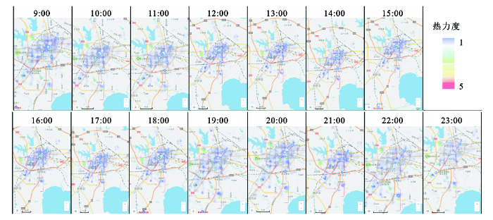 对一周内合肥市中心城区的105张热力图进行系统分析可知:工作日和非工作日的人口分布特征存在明显差异,这突出说明了人口分布特征与工作状态具有紧密关系。工作日期间,人们多选择具有商业、办公、医疗、教育文化性质的城市功能区,而非工作日期间人们主要选择具有居住、娱乐休闲、餐饮购物性质的城市功能区,表明了人口的分布特征与城市空间功能结构具有较高的一致性。工作日期间平均每天的人口分布变化为(图4):9:00~17:00,整体上人口分布集聚区的数量逐步增加,面积逐步扩大,人口活动逐步由分散走向集聚,并且在17:00达到全天峰值;17:00~19:00,人口分布集聚区面积迅速减少,人口活动强度迅速减弱,空间分布呈分散状态。19:00~23:00,人口分布集聚区逐渐消失,人口集聚程度达到了最小值,热力图呈现淡紫色的冷色调状态(图5)。特别的,12:00时刻人口集聚达到了上午峰值,之后到13:00显著下降,说明在中午下班休息时间内,人口在空间上分散和集聚的变化波动较大。图5是周五(6月9日)的人口分布热力图,其明显地反映出上述“分散-集聚-分散”的变化特征。