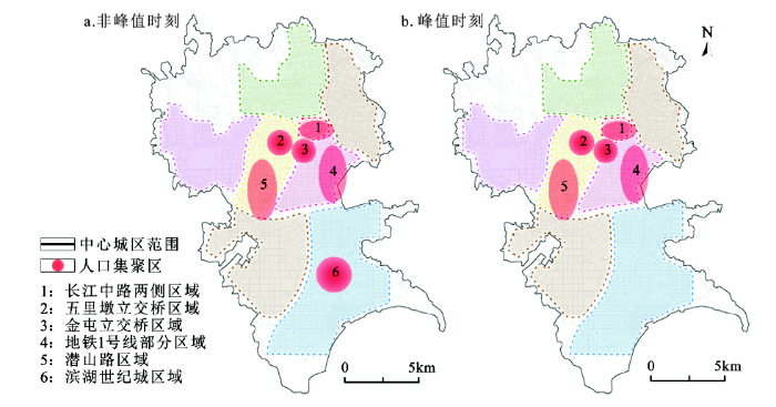 根据105张热力图可以发现合肥市中心城区的人口分布主要形成了6个集聚区:老城区的长江中路两侧区域,蜀山区的五里墩立交桥区域和潜山路区域,包河区的金屯立交桥区域,地铁1号线的部分区域(合肥工业大学南区地铁站周边、朱岗地铁站周边和合肥南站地铁站周边),滨湖分区的滨湖世纪城区域。而根据上述12:00和17:00两个峰值时刻看,人口分布主要形成了5个区域即老城区的长江中路两侧区域、蜀山区的五里墩立交桥区域和潜山路立交桥区域、包河区的金屯立交桥区域、地铁1号线的部分区域(合肥工业大学南区地铁站周边、朱岗地铁站周边和合肥南站地铁站周边)。对比可知,两个关键时刻的人口集聚区中少了滨湖分区的滨湖世纪城区域(图6)。这就表明,尽管滨湖分区是合肥市近年来正着力打造的新城区,但和传统的合肥市中心城区其他区域相比,其吸引人口集聚的能力仍有待提高。