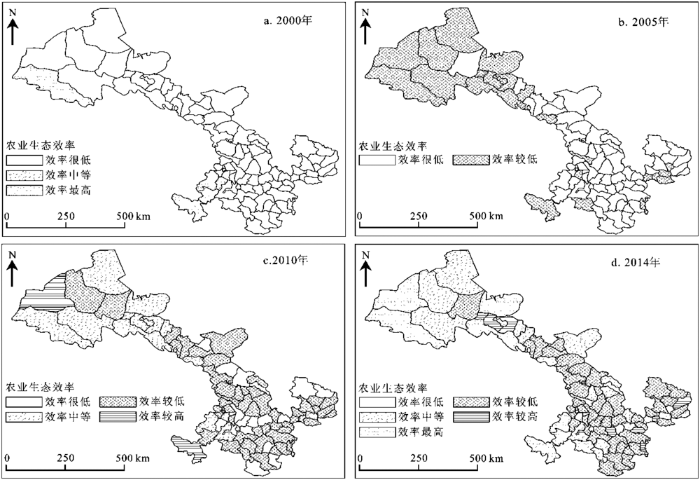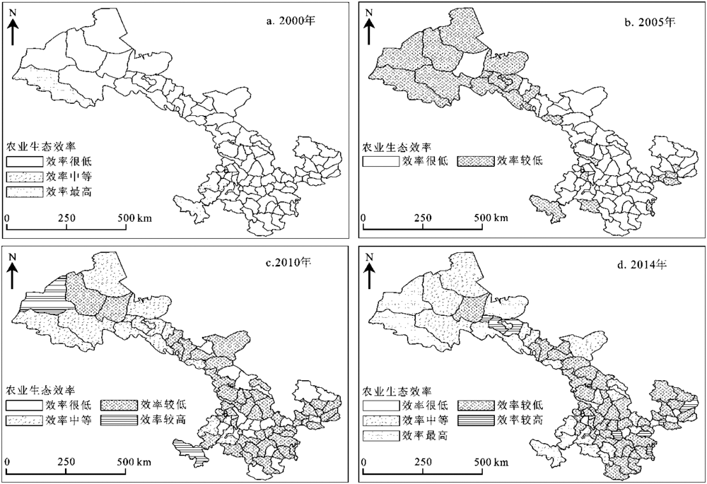根据计算得到的甘肃省82个县(区)农业生态效率,借助ArcGIS 10.2软件,选取2000、2005、2010和2014年绘制各县(区)农业生态效率分布图(图2)。