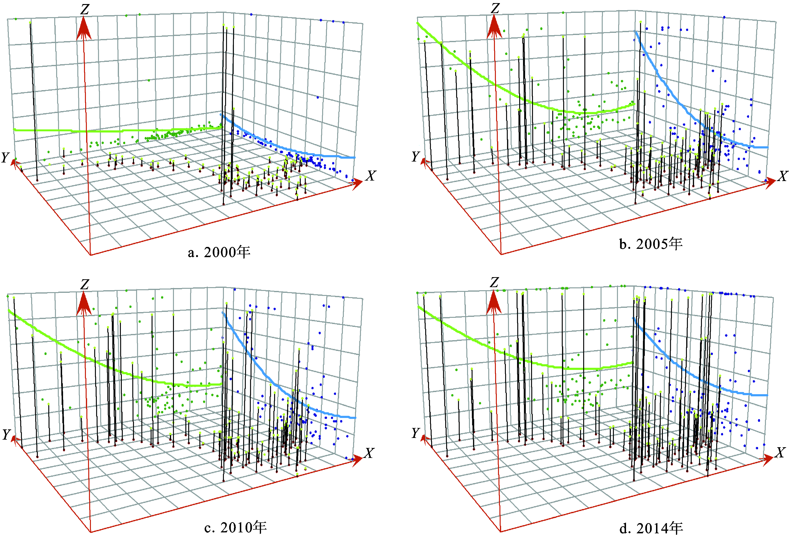 利用ArcGIS10.2软件的趋势分析工具,选取2000、2005、2010、2014年甘肃省82个县(区)农业生态效率作为Z值,X、Y值分别为正东、正北方向,生成三维趋势图(图3),以揭示甘肃省农业生态效率的空间格局变化趋势。
