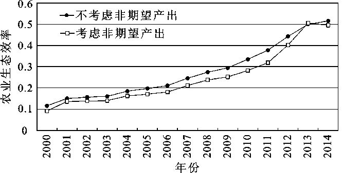 1) 不考虑非期望产出的农业生态效率值明显高于考虑非期望产出的农业生态效率值,说明不考虑非期望产出的效率值高估了实际农业生态效率,而考虑期望产出值更符合实际的农业生产过程,但两者效率值均处于较低水平状态。