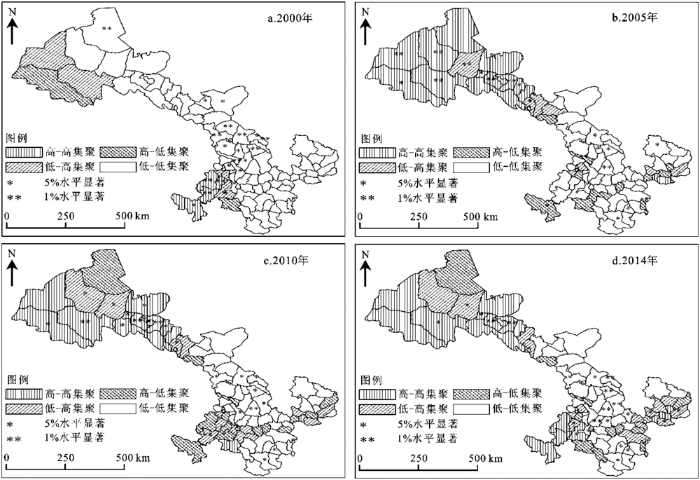由于全局自相关Moran’s I指数不能表明某一具体地区的空间集聚特征,因此为研究甘肃省82个县(区)农业生态效率是否存在局部集聚现象,结合Moran散点图和局部Moran’s I指数,选取2000、2005、2010和2014年绘制甘肃省各县(区)农业生态效率的LISA集聚图,如图4所示: