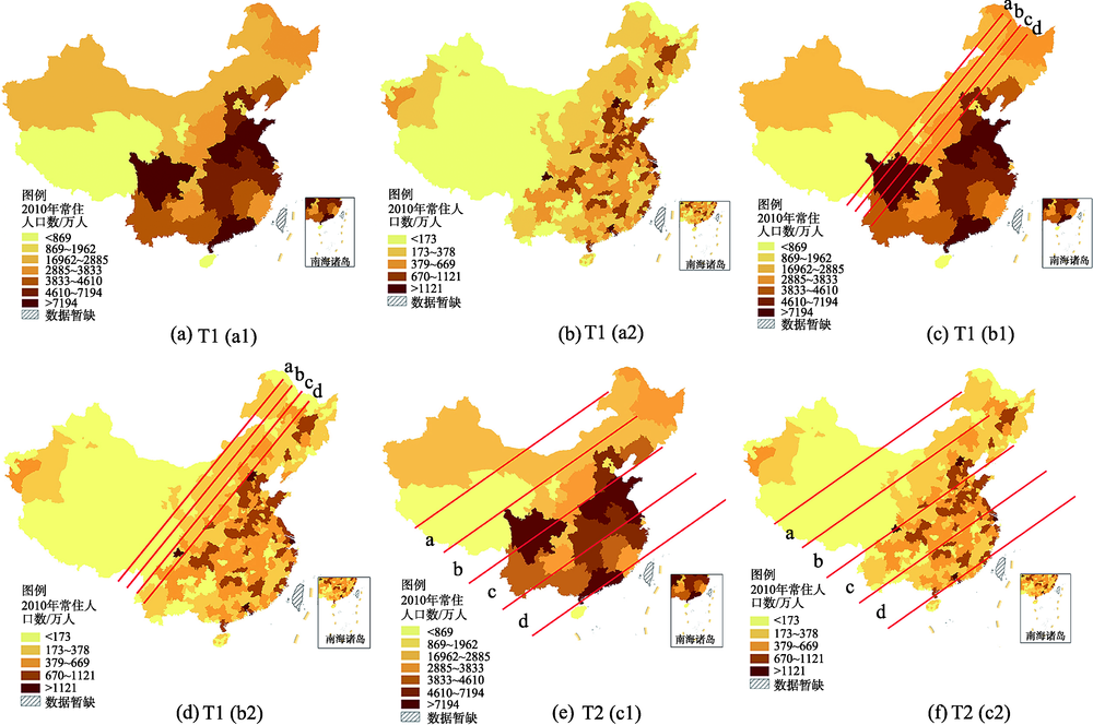 | T1 | a1 | 根据省级尺度人口分层设色图T1(a1)设想使人口分布差异最大的分界线 |