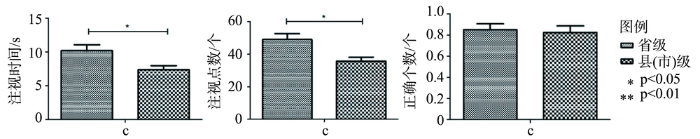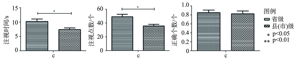 分析实验结果发现,用省级尺度的T2(c1)用图和县(市)级尺度的T2(c2)用图作为刺激材料,在认知给定区域中人口密度时,不同尺度的正确个数相差不大,县(市)级尺度的注视时间和注视点数明显少于省级尺度,注视点数差异显著(p=0.03<0.05),注视时间差异显著(p=0.039<0.05)。