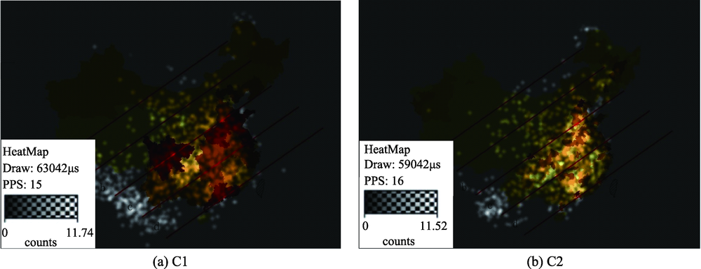 总体来看,读图者注视点形成的亮区与中国人口空间分异规律基本保持一致,呈现出东多西少的分布特点。注视热点区域形成的亮区在省级人口地图上跨越了辅助标记,呈不规则连续块状。在县(市)级的人口地图上,读图者注视点形成的亮区,与辅助标记近似平行,呈条带状。在省级人口地图上,注视点形成的亮区分布范围较县(市)级更广,而县(市)级的注视亮区面积较小,主要集中于c、d选项所在的中部地区与东南地区。