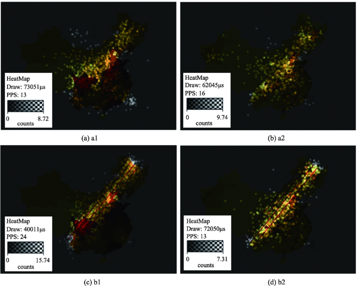 通过分析读图者注视点的空间分异规律,可以更直观地对读图者的认知规律进行分析。由图3可知,在a1、a2任务中,认知省级尺度人口地图时,读图者的注视点主要集中于分界线附近人口数量较多的地区:如四川地区、京津冀地区。在认知县(市)级的人口地图时,注视区域较准确地在分界线附近形成了较窄的认知条带。