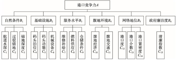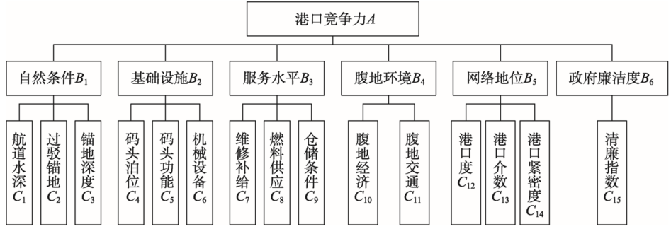A为目标层,即本文构建的影响指标均是用于对港口竞争力进行评价;B为一级指标,即与目标层有直接联系的评价指标;C为二级指标,即与上一层有直接联系的评价指标。港口综合竞争力表示为: