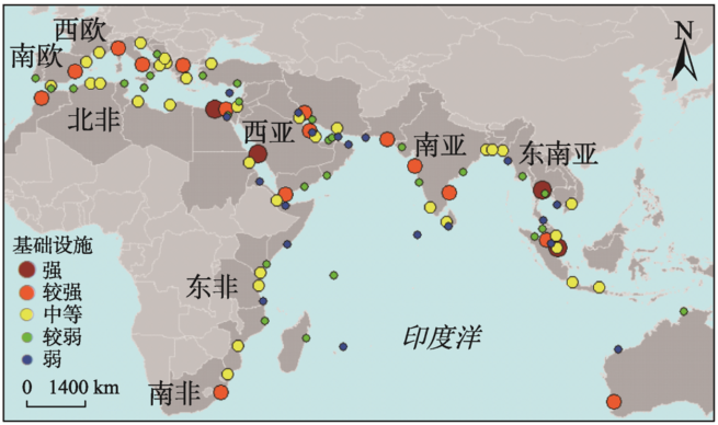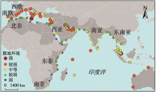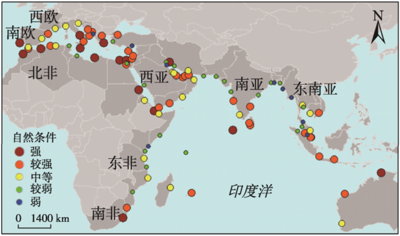 在空间布局上,这些港口呈明显的区域化特征。除竞争力最强的新加坡港外,竞争力较强的港口多位于地中海沿岸的欧洲国家,以及阿联酋和澳大利亚西海岸;北非国家和印度的港口竞争力处于中等及以下水平;东非国家和孟加拉湾的港口竞争力最弱。港口竞争力受国家发展水平影响显著,竞争力较强的港口均在发达国家,竞争力弱的港口一半以上位于最不发达国家或地区。同时,竞争力较强的港口多居于重要的水域要冲地带,是世界主要船舶的必经之地,如位于马六甲海峡的新加坡港、霍尔木兹海峡的豪尔法坎和迪拜港、苏伊士运河的塞得港、直布罗陀海峡的阿尔赫西拉斯等。
